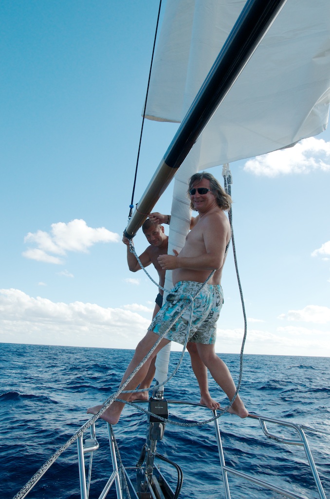 czas na zwrot przez rufę – Mariusz i Tomek uwalniają róg szotowy, który zablokował się w bomie spinakera podczas jazdy na motyla